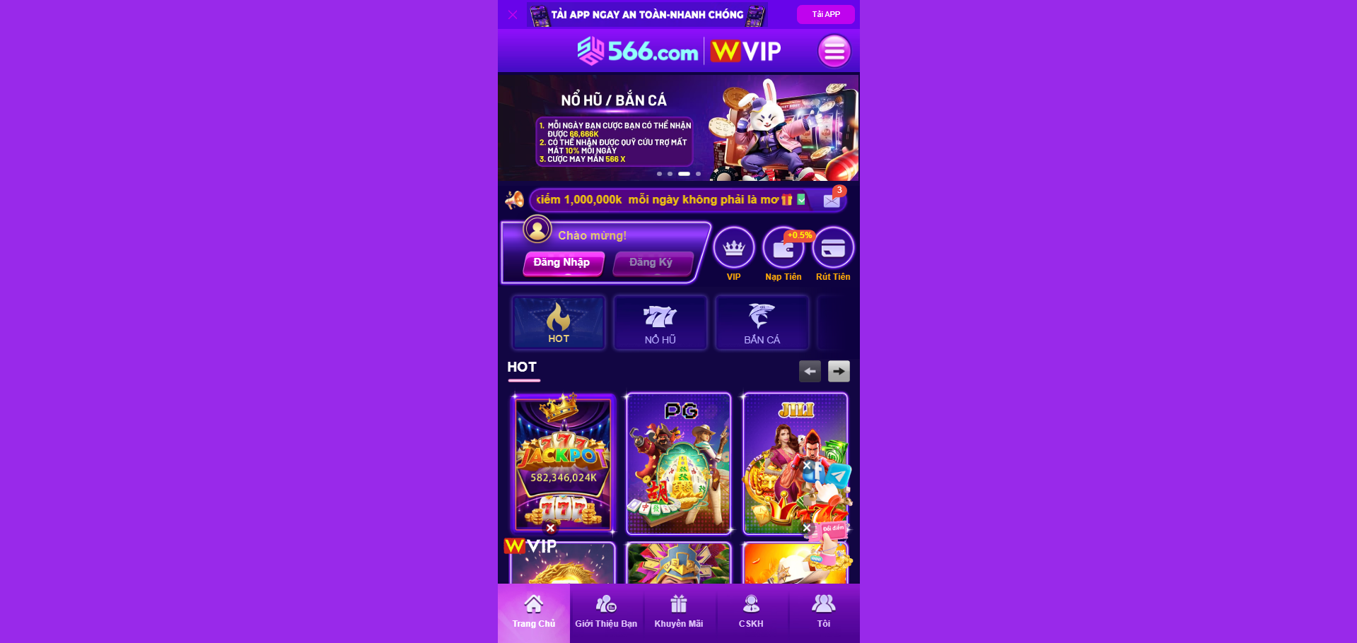 Chương trình khuyến mãi hàng ngày, hàng tuần và hàng tháng. Giá trị lên tới 56.000.000, nạp đầu tặng 100%, hoàn trả tới 3%.